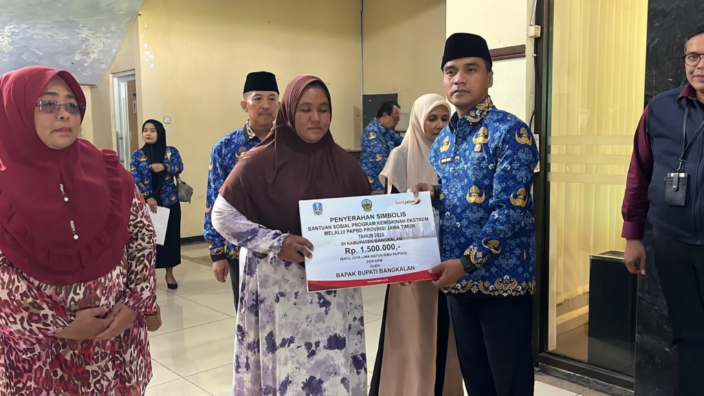 Bangkalan – Pemerintah Kabupaten Bangkalan menyerahkan secara simbolis Bantuan Sosial Bantuan Langsung Tunai Sementara Kesejahteraan
