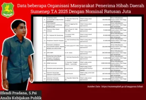 Sumenep — Pengelolaan hibah Pemerintah Kabupaten Sumenep Tahun Anggaran 2025 kembali menjadi sorotan publik. Analis kebijakan publik Kabupaten Sumenep, Efendi Pradana, S.Psi, melayangkan kritik tajam